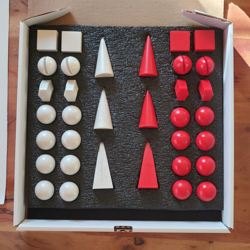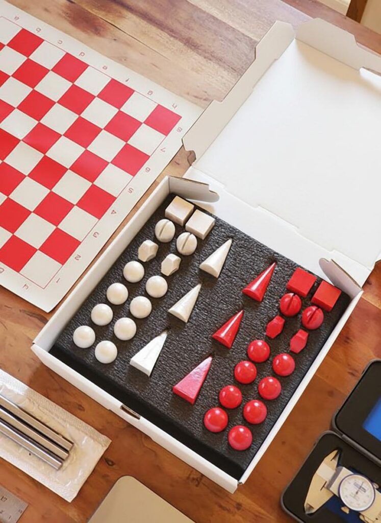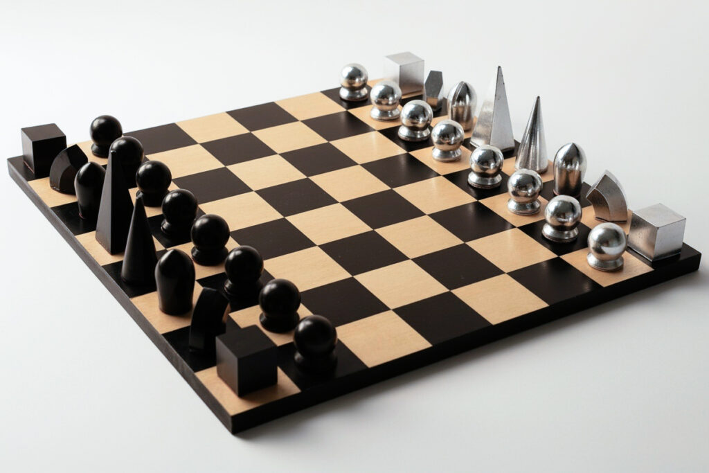 When Man Ray designed his chess set in 1924, he treated each piece as an abstract sculpture. Instead of mimicking crowns, bishops, or knights, the forms reference Euclidean solids: the pyramid, sphere, and cone. This approach was consistent with his work in the Dada and Surrealist movements, where function and absurdity often overlapped. Like Duchamp—himself a serious chess player—Man Ray saw the game as a site where art could intervene in everyday life. The chess set therefore belongs not only to the history of design, but to the avant-garde project of collapsing boundaries between art and play. The Silver/Black Edition here recalls this emphasis by heightening contrast, turning the set into a study in form and shadow.