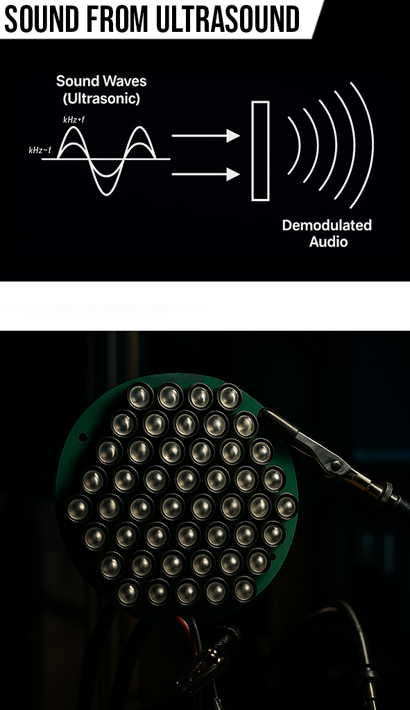 WHISPER™ uses modulated ultrasonic carriers that travel silently through air, with no audible output at the source. When the beam encounters a nonlinear medium — a wall, an object, or even the human body — the signal self-demodulates and reconstructs into audible sound. This effect allows the system to project audio into space as if the air itself were a speaker, while remaining inaudible outside the target path.