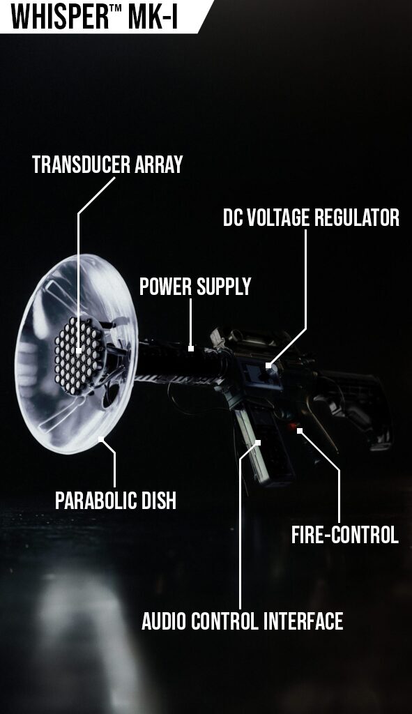 The WHISPER™ MK-I isn’t just advanced, military-grade hardware—it’s control over sound itself. A next-generation directional signaling system, it delivers messages with surgical precision: across a room, down a street, or directly into the ear of your audience. Your message goes exactly where you intend it, delivered with precision.