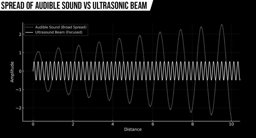 A dense transducer array concentrates energy into a tightly collimated ultrasonic beam. Beamforming keeps dispersion under a degree, enabling long-range delivery without significant spread. Because ultrasound propagates in a highly linear fashion, WHISPER™ maintains directionality over distance, producing clear, intelligible sound only where aimed and preserving silence everywhere else.